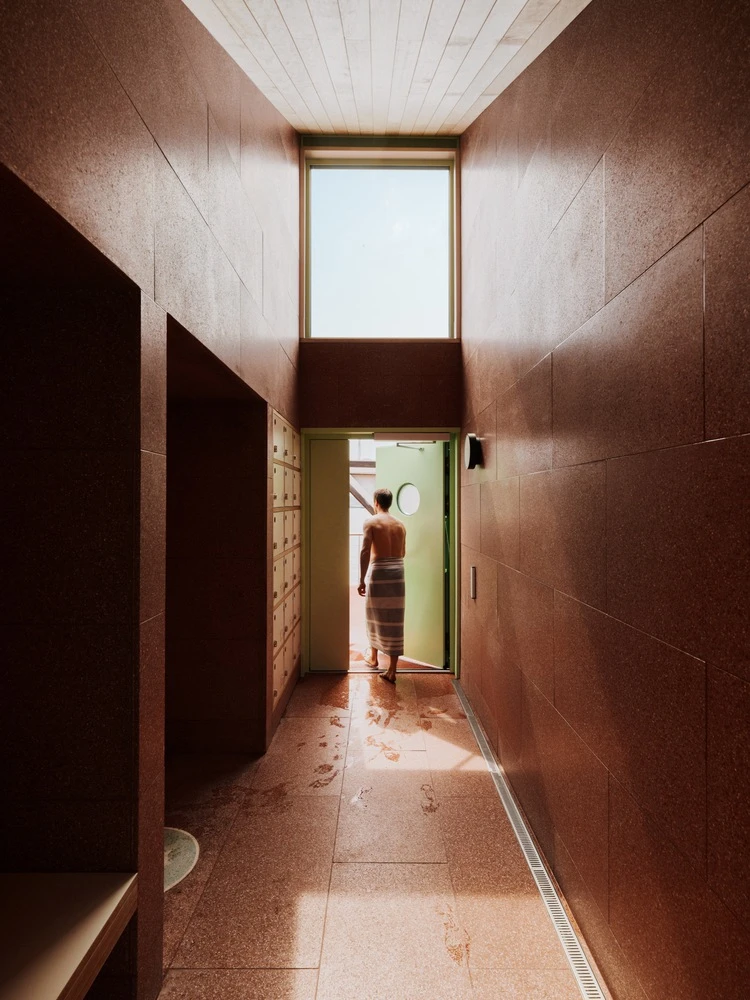 También materialidad responsable que incluye materiales naturales y reciclados e inclusión social, ya que se trata del primer sauna accesible universal gracias a su sistema de recirculación del vapor que facilita el uso en silla de ruedas desde el step inferior de la grada.