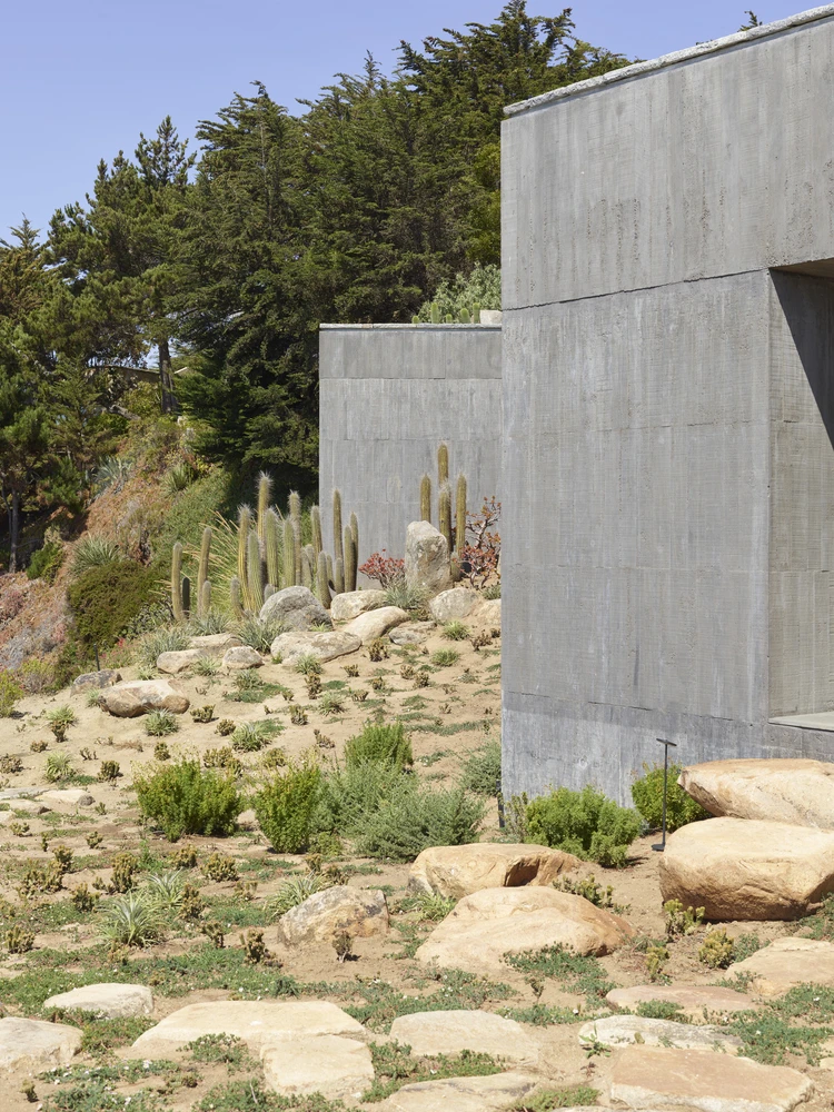 El paisajismo de esta casa chilena, diseñado por Juan Grimm, busca recuperar la flora y fauna pre-existentes en la quebrada. Recobrar lo que existía antes de la nueva construcción.