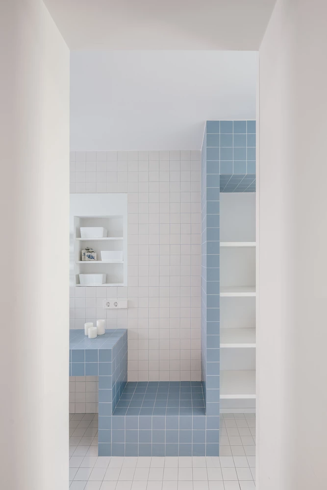 La elección de materiales es binaria: madera de roble en suelos y acabo blanco en estantería, paredes y techos. Este esquema se invierte en el área de cocina.