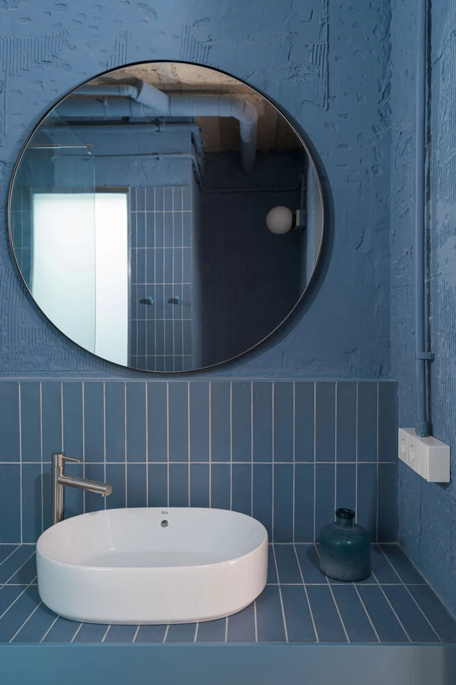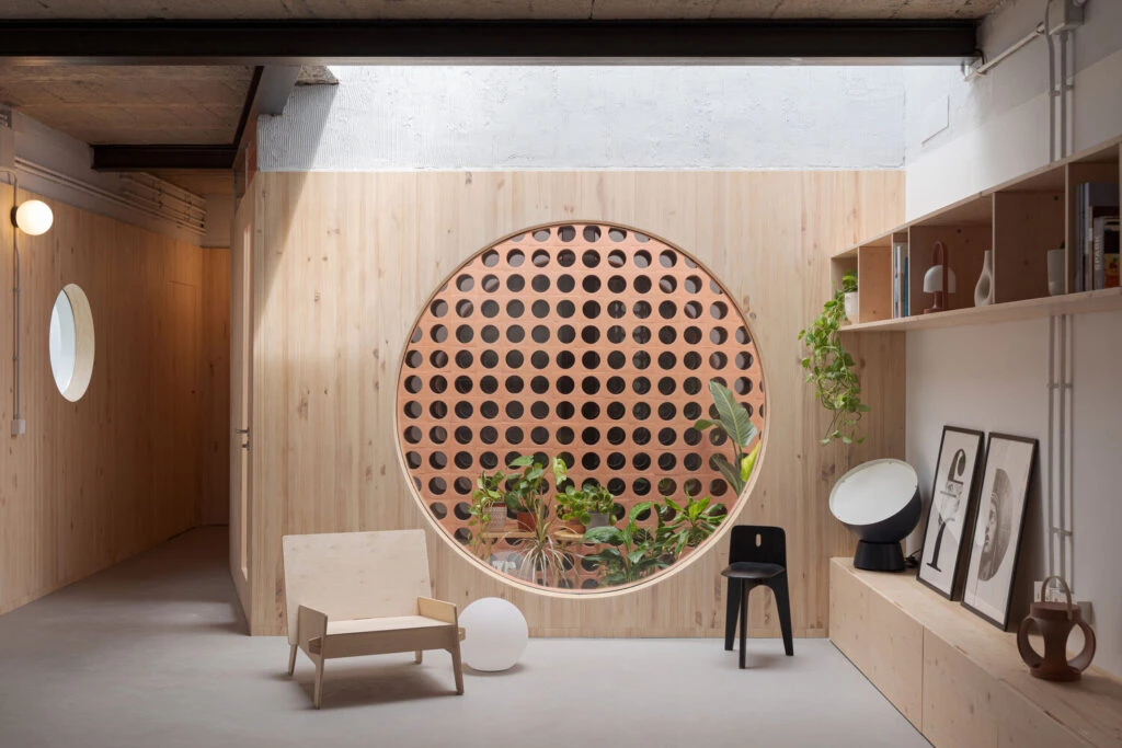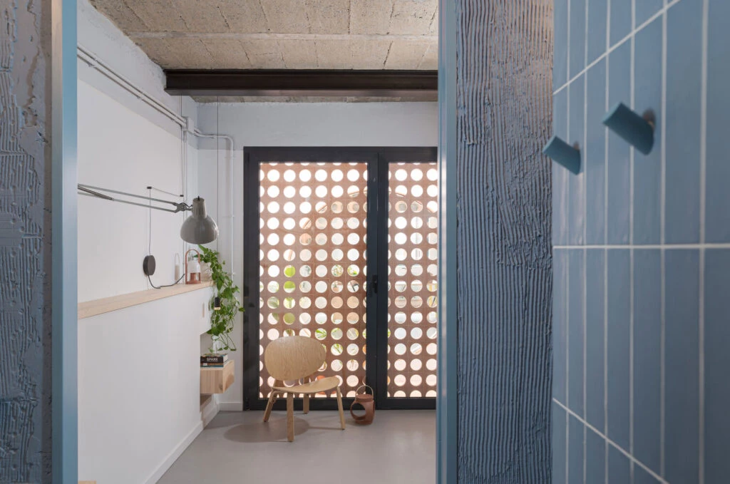 A esta apertura, disruptiva y contundente, se añade en segundo plano una celosía que tamiza la entrada de luz en el dormitorio principal y refuerza la teatralidad del espacio. Se introduce a partir de aquí un nuevo lenguaje formal, un conjunto de perforaciones circulares de distinta escala que se reparten por la vivienda, multiplicando tanto la entrada de luz natural como las relaciones visuales.