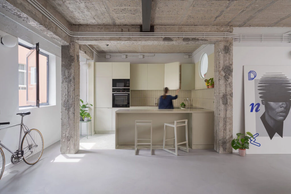Aunque arquitectura original no presentaba especial interés, intervenir en una edificación antigua siempre requiere un cierto nivel de respeto a la memoria de lo construido. En este sentido, resultó de interés significar el conjunto de vigas de cuelgue existentes, apostando por un interior deliberadamente inacabado en el que una junta coincidente con la cara inferior de las jácenas recorre el perímetro interior de la vivienda, estableciendo el límite de la nueva envolvente.