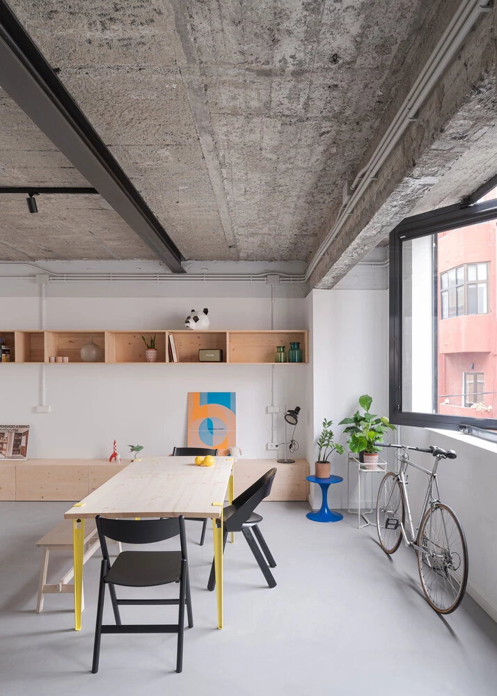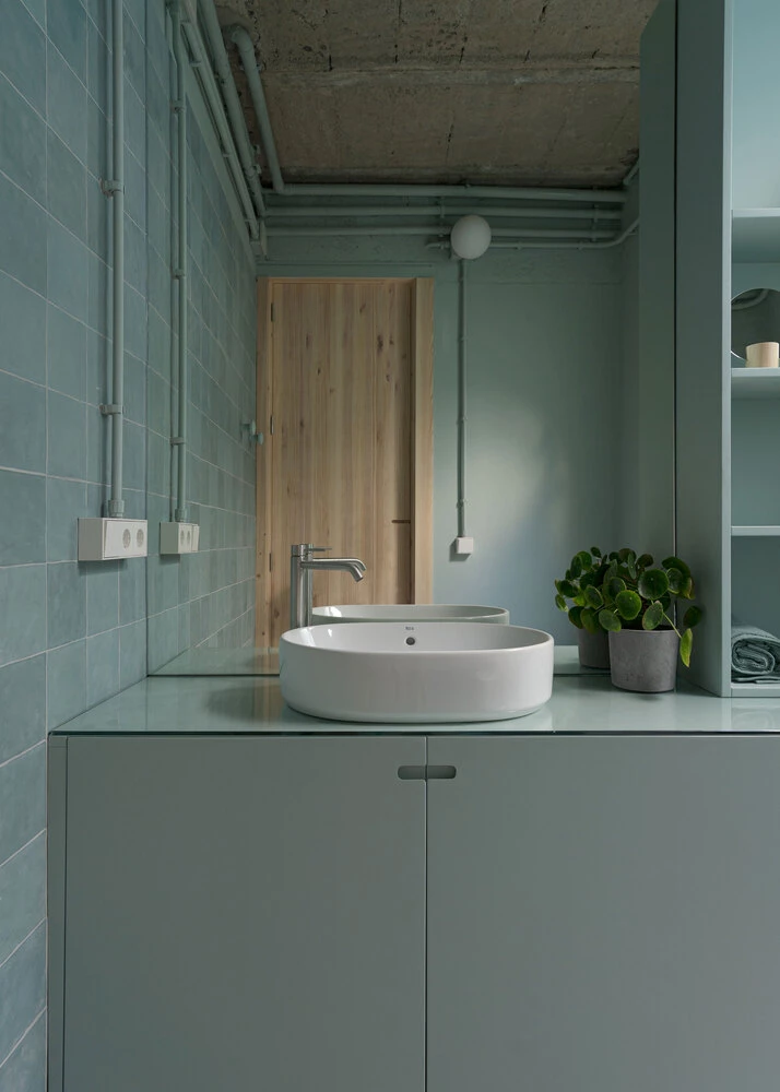 Se emplea también el pino al natural para el diseño del mobiliario, exceptuando las zonas húmedas, que se definen como espacios monocromáticos en los que resaltan las texturas de los distintos materiales.