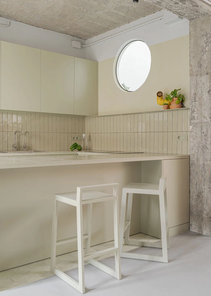 En este nuevo micropatio se abre un gran óculo de dos metros de diámetro que conecta el pequeño jardín con la zona de día, generando un telón de fondo vegetal en la casa.
