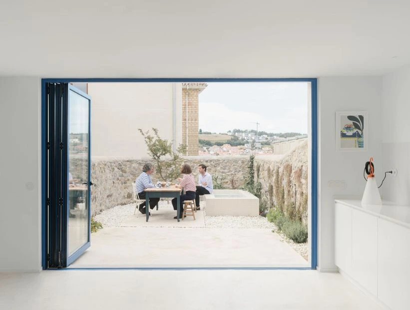 El patio está delimitado por un muro de piedra existente en forma de herradura y extiende el suelo interior de la casa con islas de hormigón pulido que permiten integrar la vegetación autóctona. En el extremo norte se habilita una pequeña pileta para refrescarse en los días más calurosos.