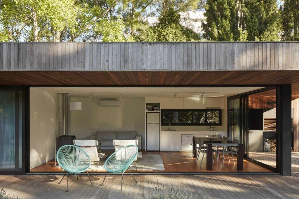 Dicha abertura no solo conecta con el exterior, sino que carga el proyecto de flexibilidad para aprovechar al máximo el área del jardín, sumando una galería que recorre todo el largo de la casa, diluyendo el contacto directo y abrupto con el exterior.
