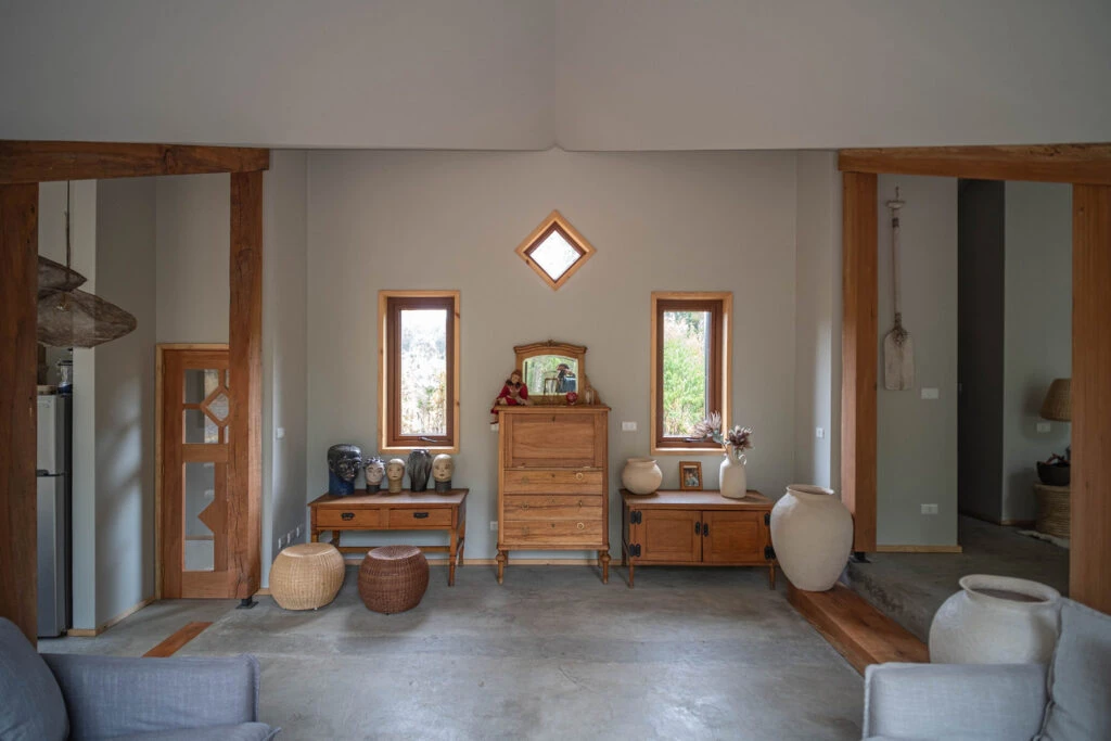 El interior combina yeso blanco, madera reciclada de antiguos puentes y un piso continuo de hormigón vitrificado hecho a mano por un ceramista local.