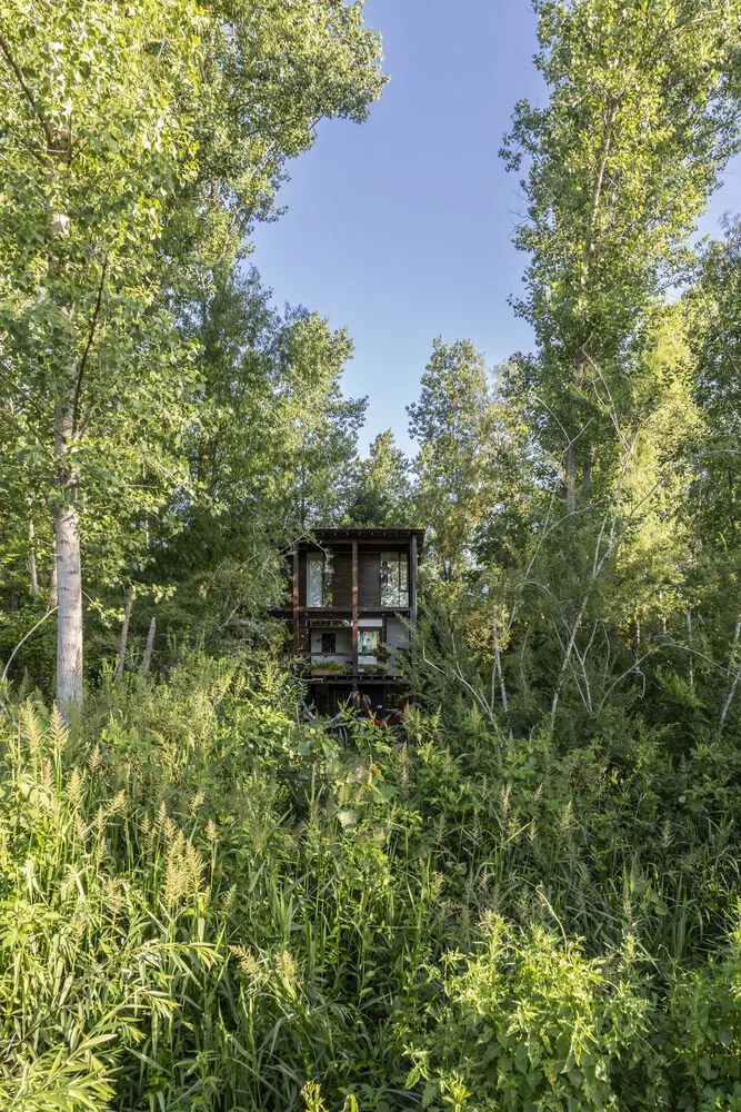 En una isla del Delta del río Paraná, escondida entre los árboles pero cercana al canal de acceso, se encuentra "Casa BOU", una caja negra prefabricada de 150 m2 diseñada por el estudio LMCO arquitectos, que sorprende con un interesante juego de llenos y vacíos que enmarcan el paisaje.