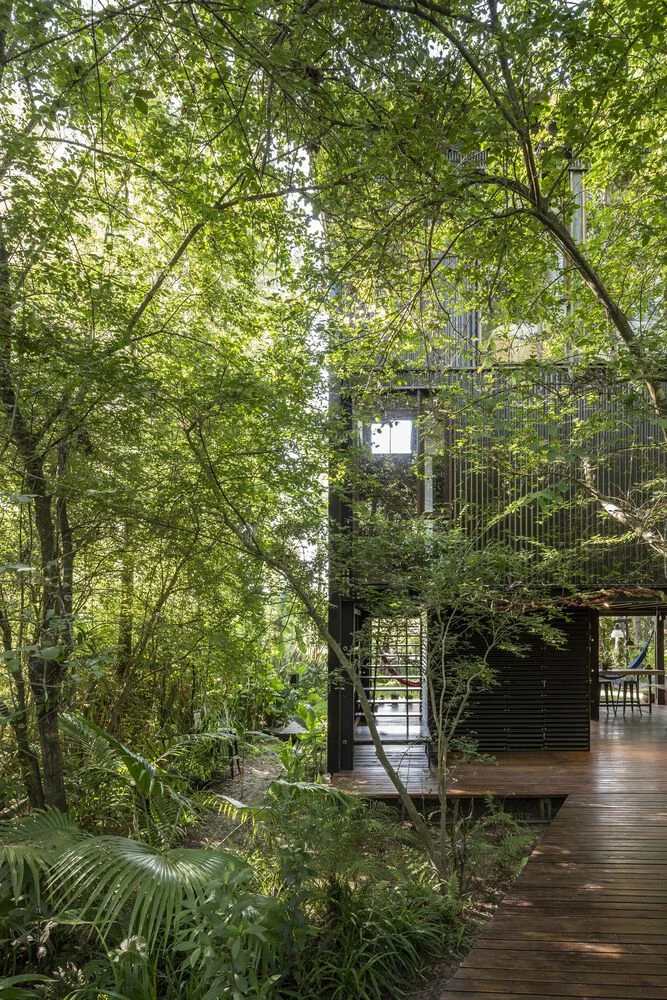 La casa se ubica entre los árboles, escondida pero cercana al canal de acceso, liberando un espacio común al borde del agua. Se perciben entre los árboles, figuras geométricas generadas por las aberturas de la caja.