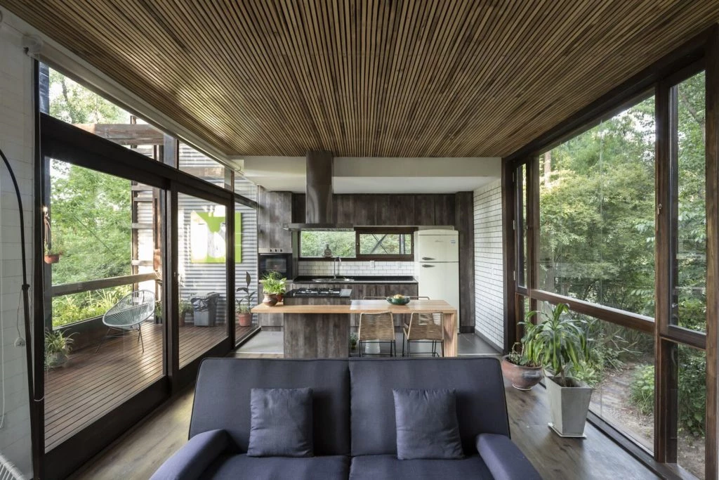 El primer nivel o el plano noble, es un espacio caracterizado por la contemplación del entorno desde la comodidad del hogar moderno. Y en el segundo nivel, también parte del desarrollo, se ubican los espacios íntimos y privados del hogar, dormitorio y estudio.