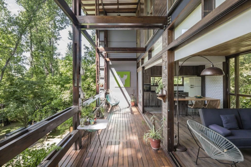 Se ubica entre los árboles, escondida pero cercana al canal de acceso, liberando un espacio común al borde del agua. Se perciben entre los árboles, figuras geométricas generadas por las aberturas de la caja.