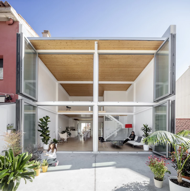 La casa se abre completamente al jardín interior, gracias a ventanas plegables que se pueden abrir completa o gradualmente según la estación del año, transformando el espacio interior en un porche.
