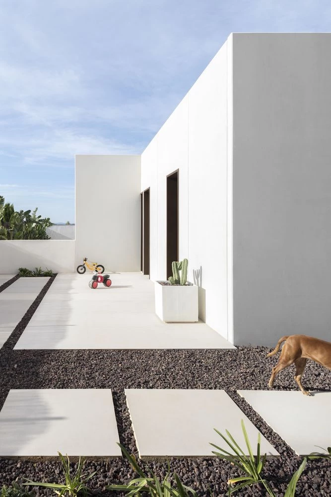 A partir de ahí, en un terreno llano sin grandes condicionantes, se busca la sencillez y la precisión de los paneles prefabricados de hormigón para configurar una vivienda de líneas puras y color blanco.