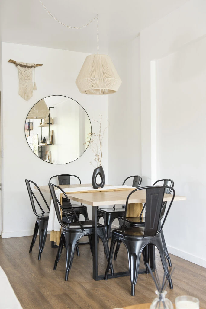 Un comedor de estilo industrial, con mesa de madera de zoita y hierro (@conpasiondeco) y sillas Tólix en color negro (@desillas). Como decoración, manteles de gasa (@sweetsun.deco), florero (@recordis_esencias_puras) y espejo redondo junto a un tapiz.