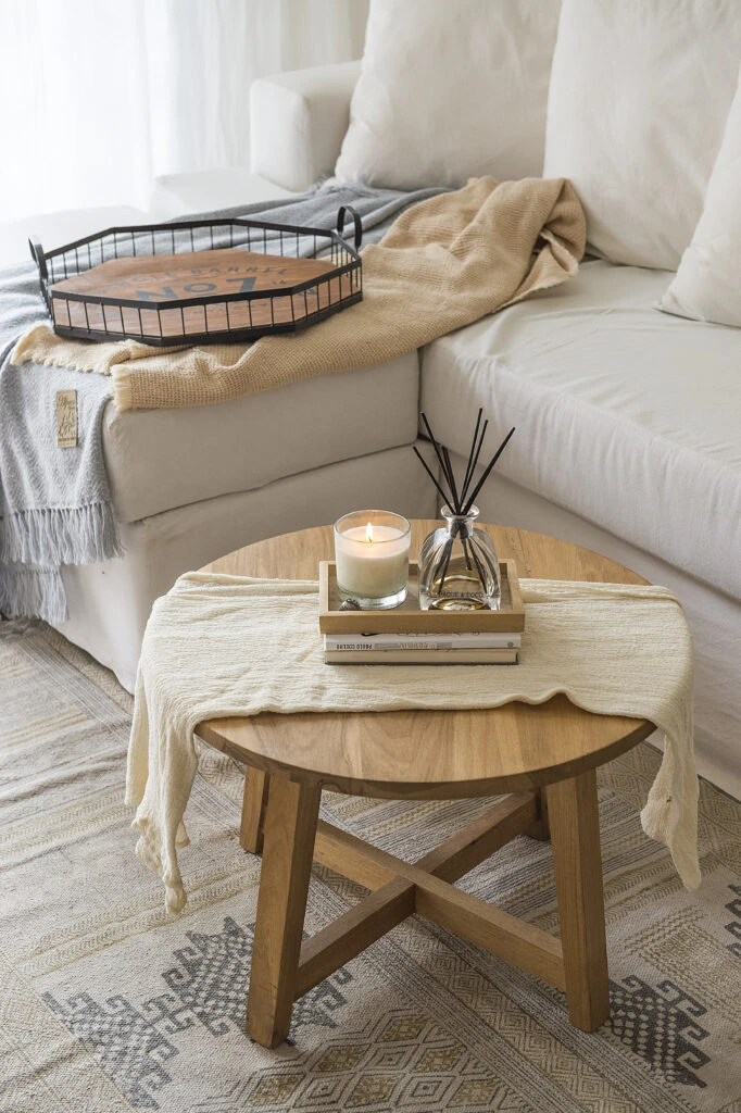 Sobre la mesa baja de petiribí, centro de mesa con difusor y vela (@paquecoco). Alfombra (@indiastyle.oficial). Detrás, bandeja de hierro y madera estampada sobre una manta (@conpasiondeco).