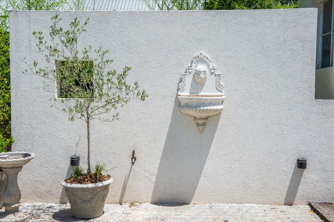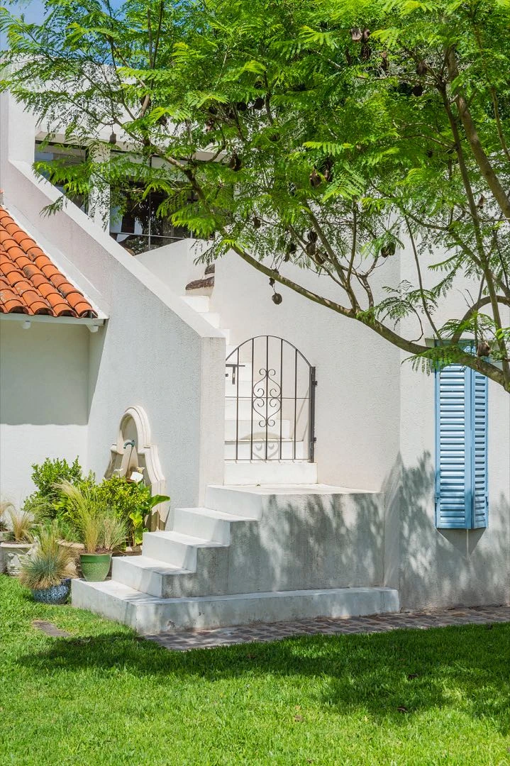 "Los postigos se compraron en un lugar de demolición y se adaptaron a las ventanas pintándolos de un celeste igual al de la puerta de entrada. Y la fuente que está junto a la escalera la diseñamos con mi marido y la mandamos a hacer a medida (por A.R Martinau) en piedra París”, describe Luti Antelo .