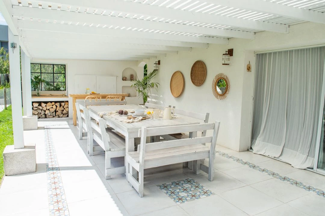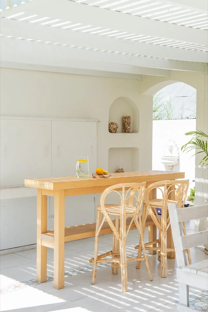“La estructura de la galería la hizo mi marido combinado madera marmelero y tablas de Ibirá Pitá; además sumamos planchas de policarbonato acanalado para que entre luz”, describe Luti. El piso es un porcelanato símil calcáreo (Cérámicos San Lorenzo).