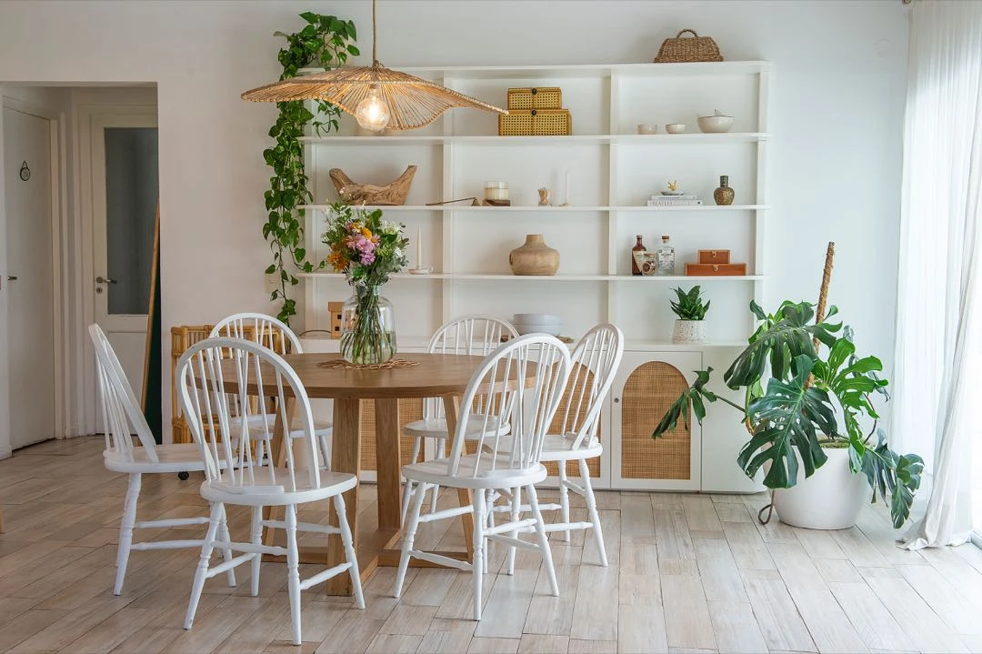 El comedor diario propone una mesa ovalada en madera de petiribí (@amarillomuebles_), sillas Windsor antiguas y una lámpara colgante (Somos Yugen).