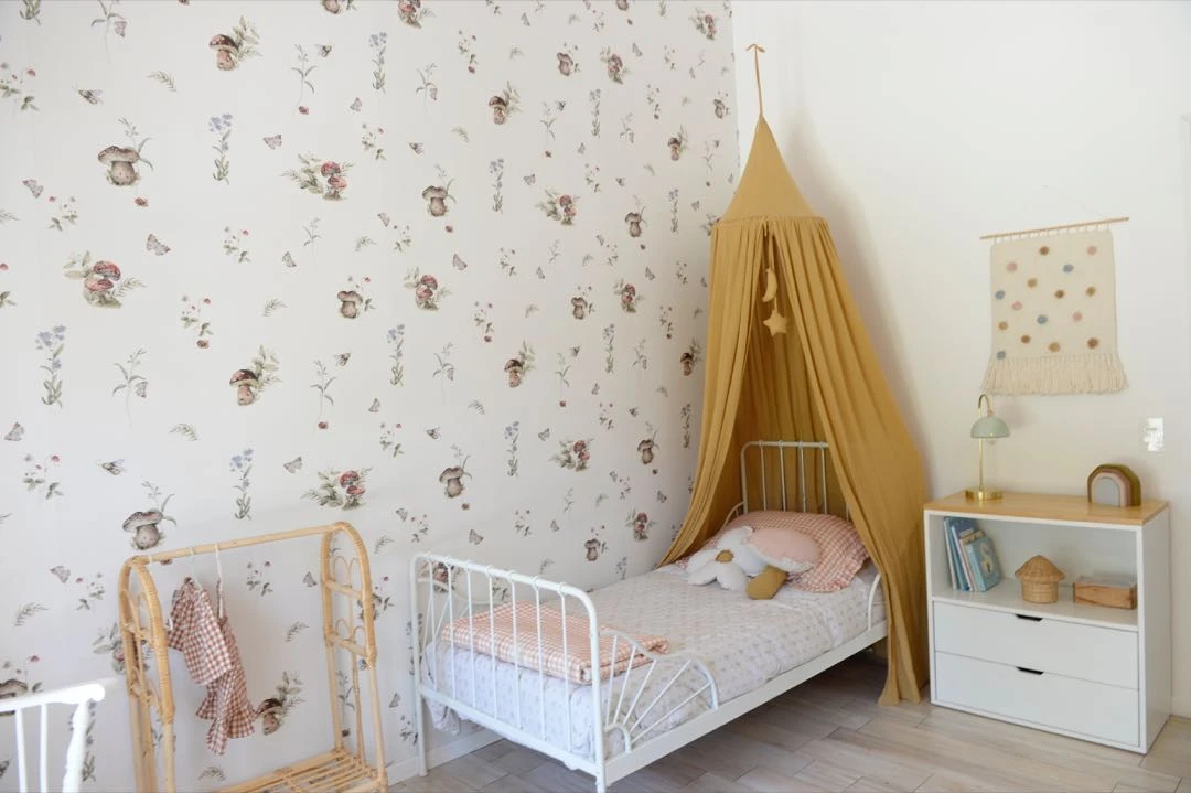 El segundo cuarto también tiene un mural (Om) como complemento de la cama de hierro (@ensambleok), con dosel (@pequeñoscaciques). Estantes con libros (@nook_deco), y mesa y sillitas (@lilacasadeco).
