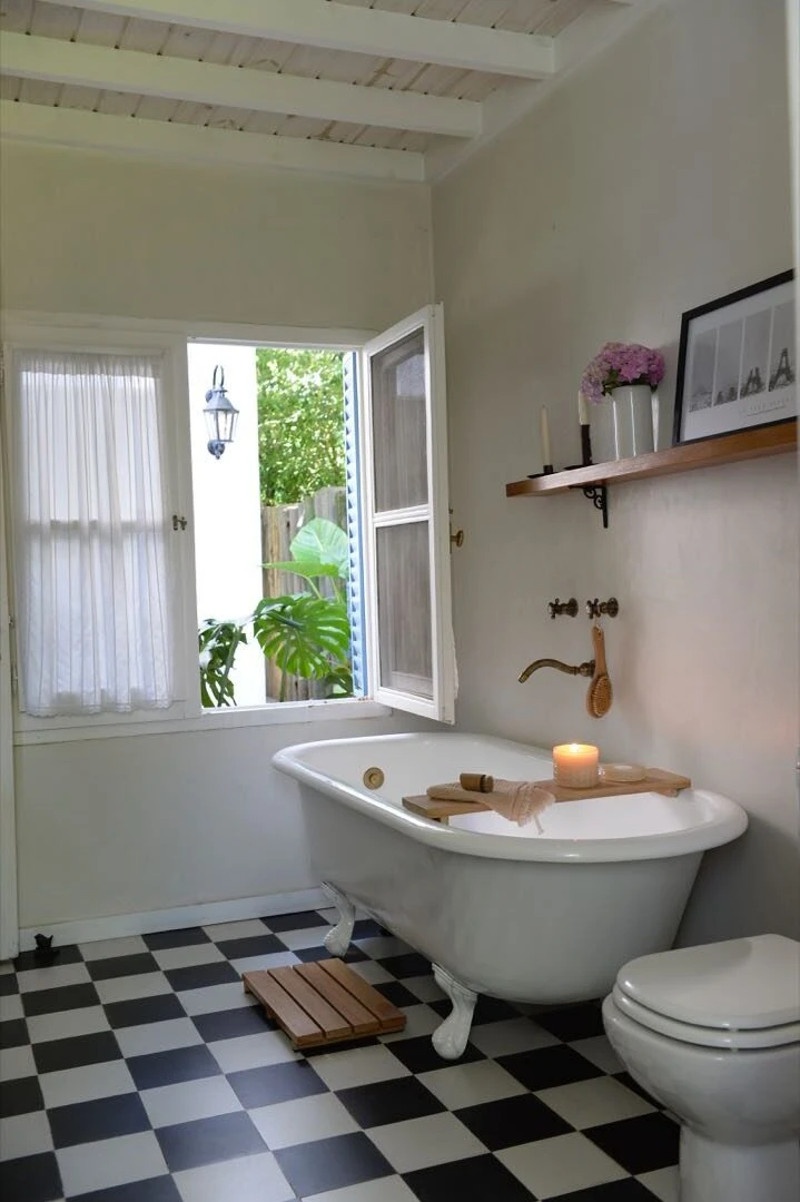 "Al baño quería darle un toque antiguo. Siempre me gustaron los pisos en damero y las bañaderas con patas -describe Luti- A la vez quería agregar una ducha por comodidad pero sin mampara de vidrio, así que optamos por hacerla de cemento alisado y jugar con la onda mediterránea y más vintage”