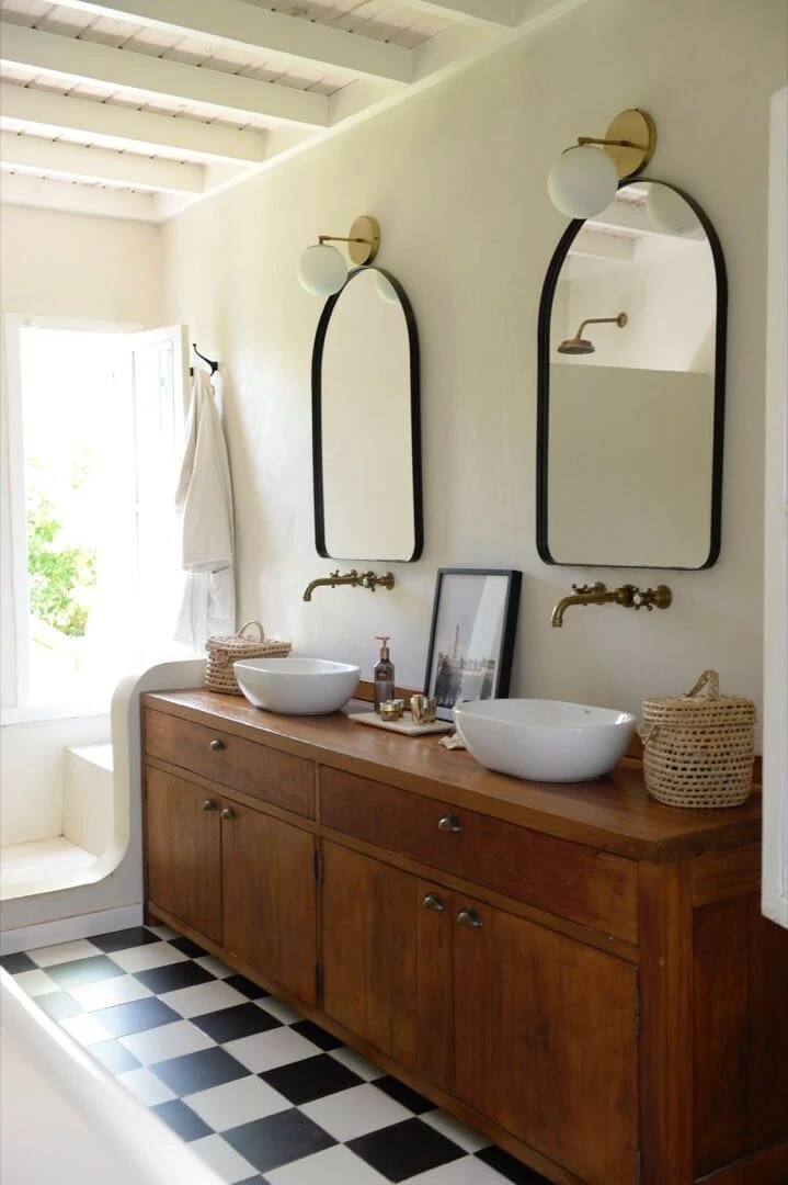 El piso es un porcelanatos (Cerámicos San Lorenzo) y la bañera es antigua y se mandó a restaurar. Completan el mueble vanitory de pino Oregon (@casaperri), las bachas (Roca), las griferías (@robinet) y los espejos de hierro artesanales (@antiguovagondeco).
