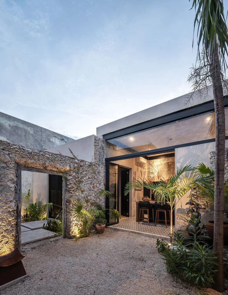 Es en estas áreas de la casa en donde se toma la decisión de respetar las antiguas ruinas, pero incorporando nuevos materiales y sistemas constructivos, “asentando” sobre los viejos muros de mampostería, un marco de vigas metálicas tipo “I” y sobre este la nueva losa con recubrimiento de chukum.