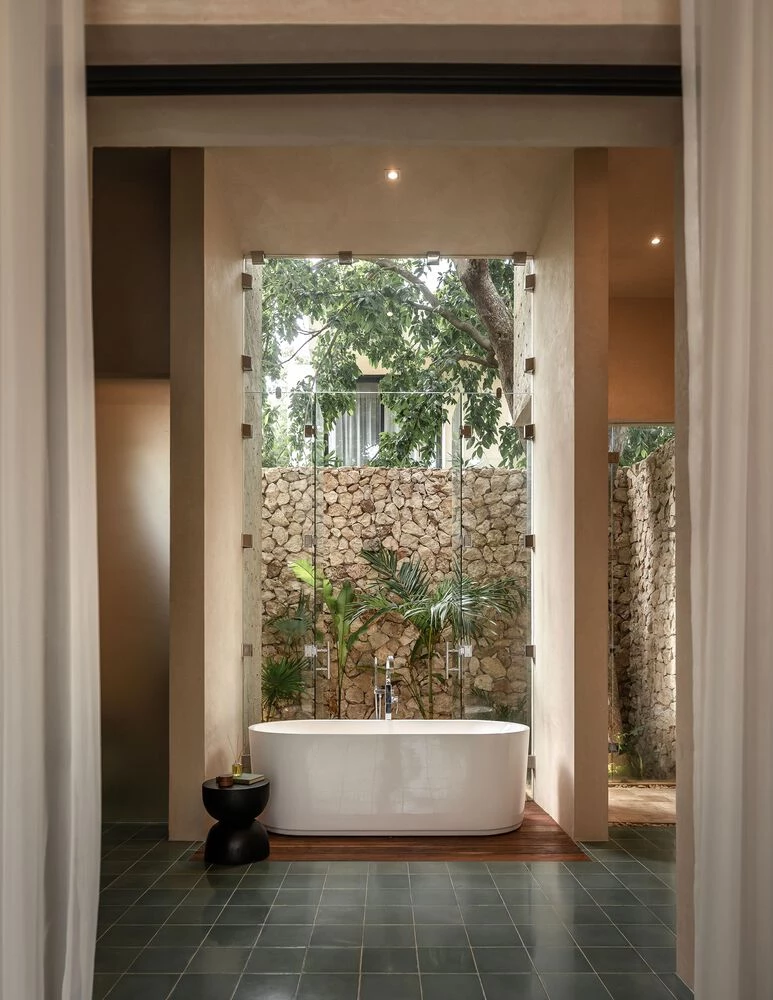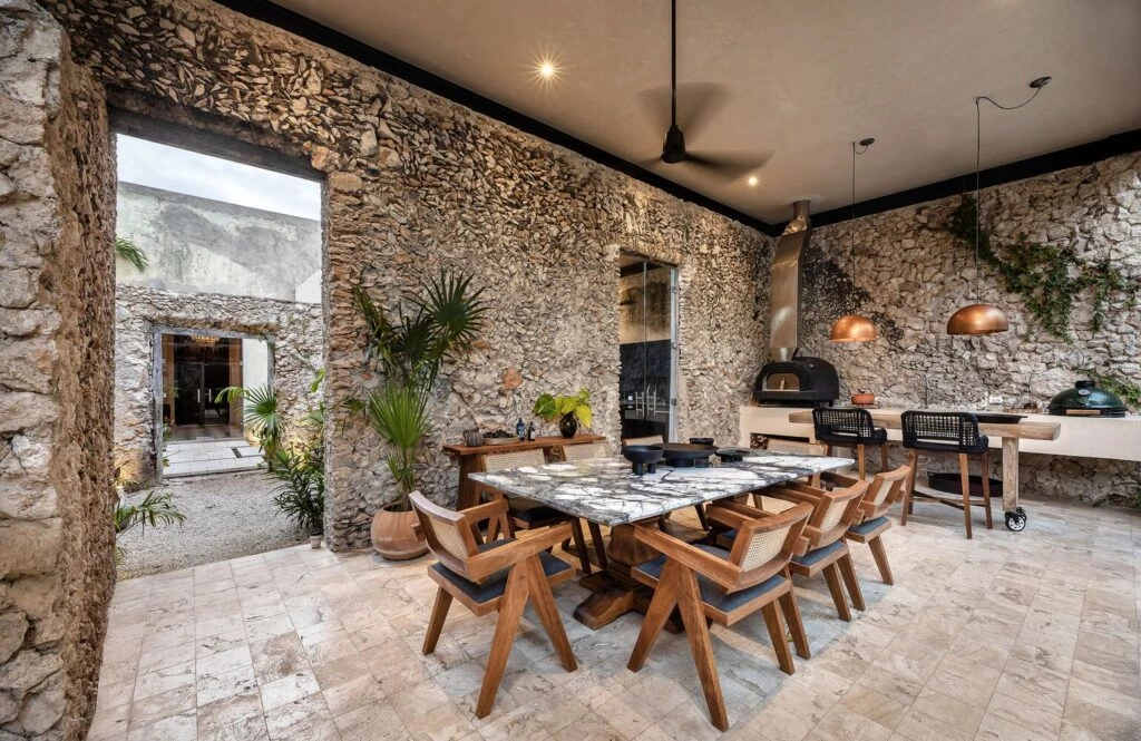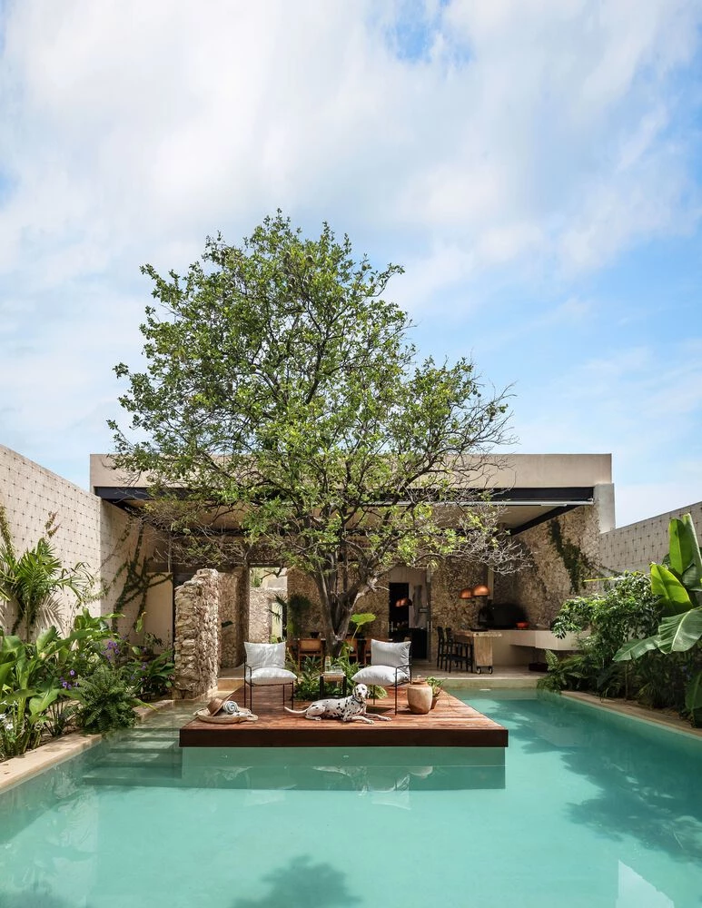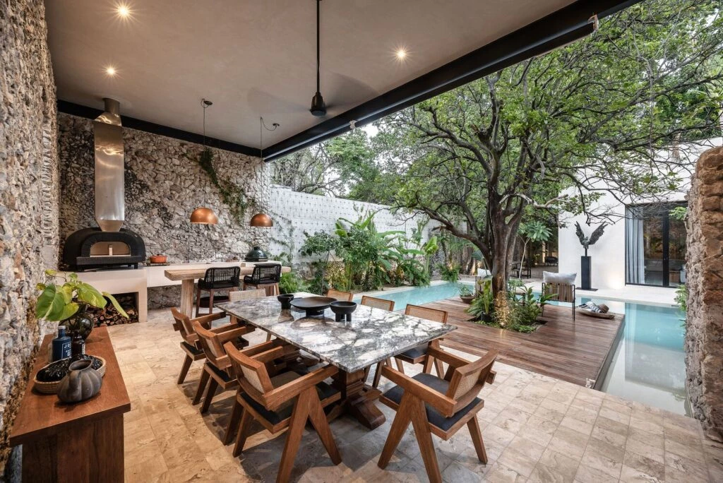 Esta zona funciona como una cocina y comedor exterior, creando un lugar idóneo para la convivencia, mientras se disfruta de la vista hacia la piscina de chukum en donde un deck de madera de tzalam flota sobre el agua y en donde se proyecta un bello juego de luces y sombras de la fronda de un típico árbol de naranja agria o Pak`áal en maya.