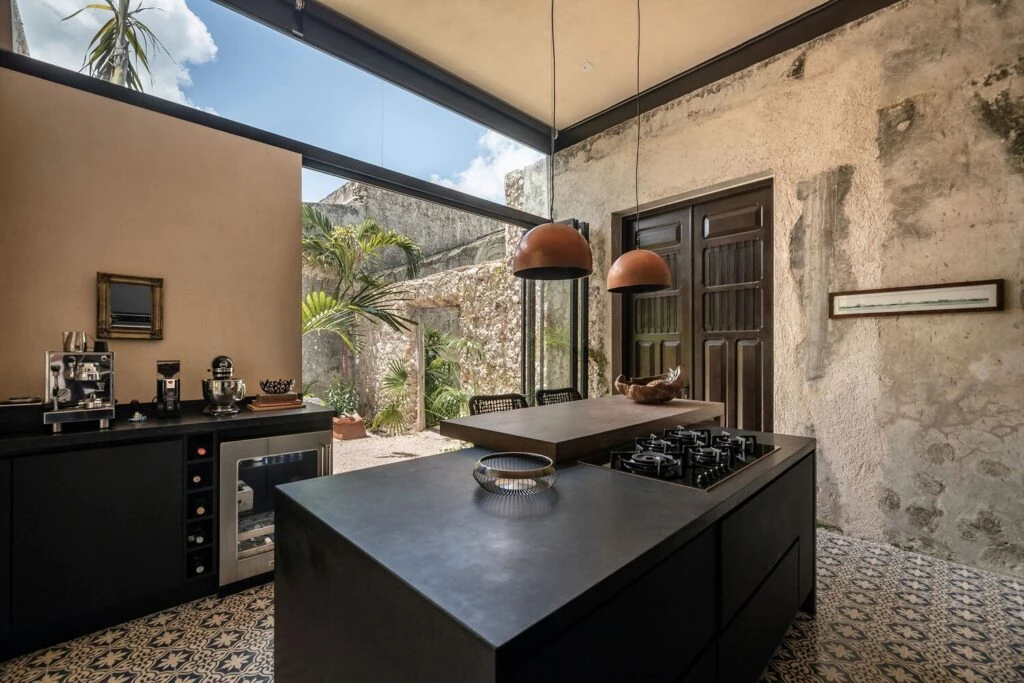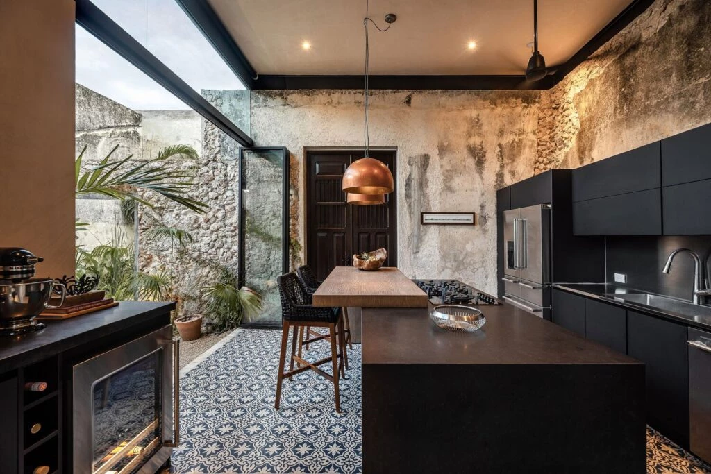 Las paredes interiores de la cocina conservan sus acabados originales como un testigo tangible del paso del tiempo, contrastando con el diseño moderno de la cocina integral y el piso de pasta.