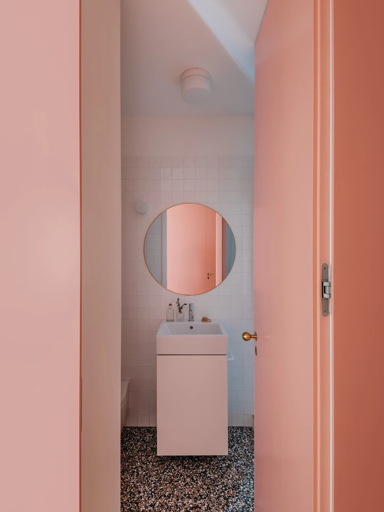 El área social se concibió como una sucesión de espacios fluidos que ocurren a través de la implementación de dos paredes no ortogonales, pintadas de color rosa.