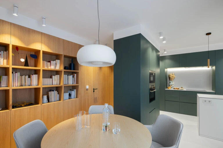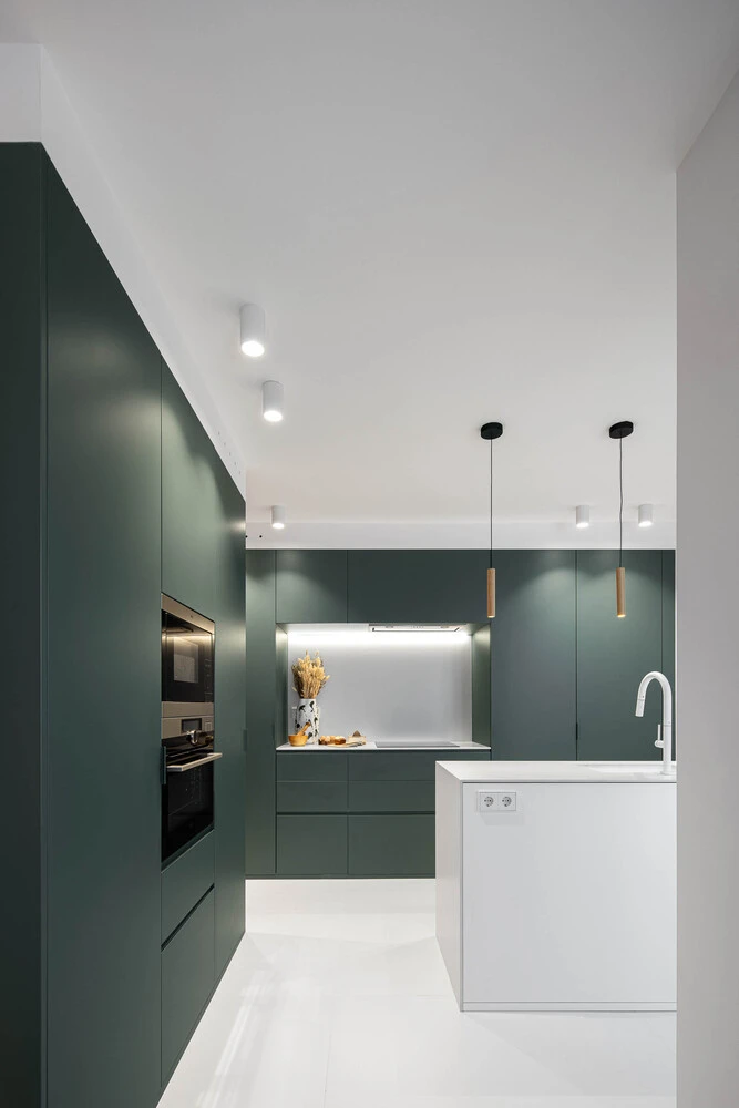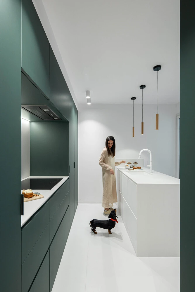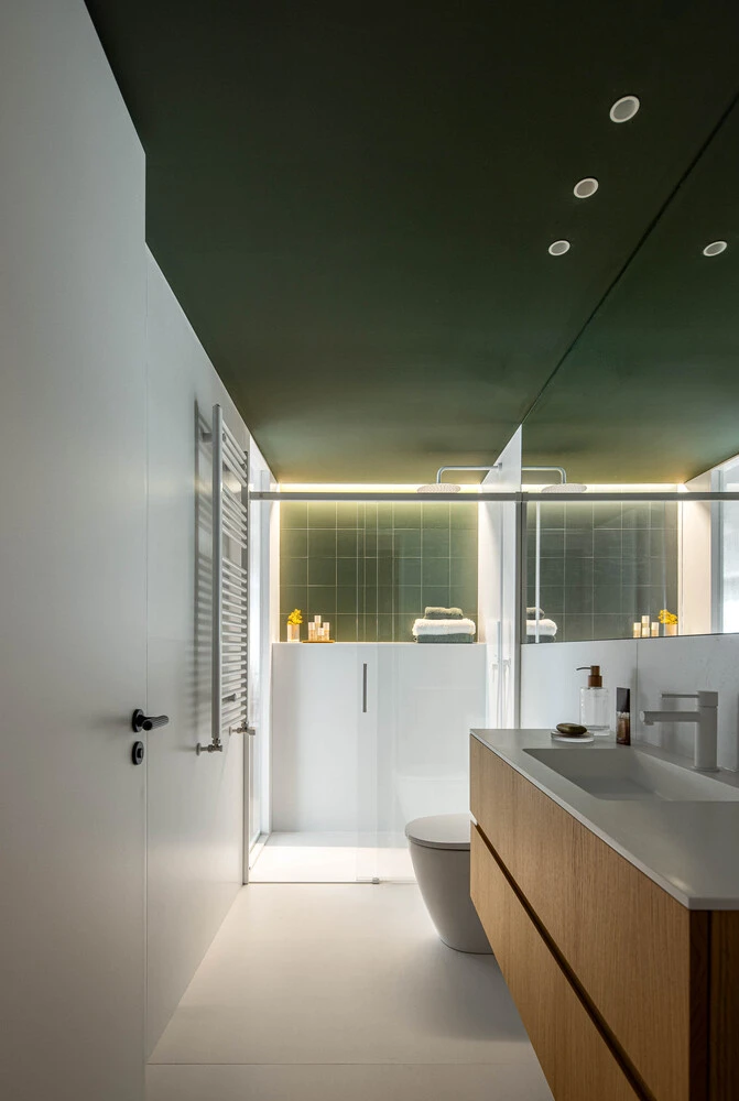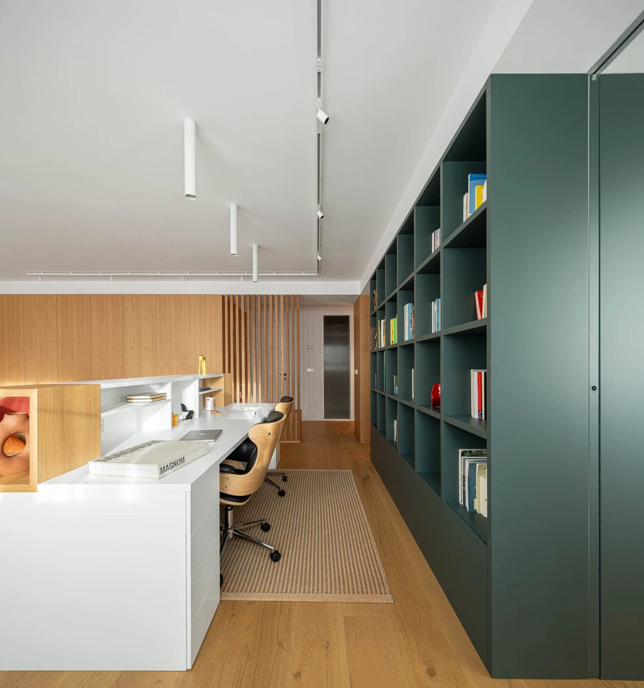 El color verde oliva consigue la separación entre distintos espacios y el blanco como elemento que lo une todo.