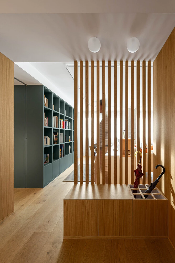 El espacio de unión de ambas zonas no es un simple pasillo: es un elemento que sirve de almacenaje e hilo conductor a los distintos ambientes a los que da servicio.