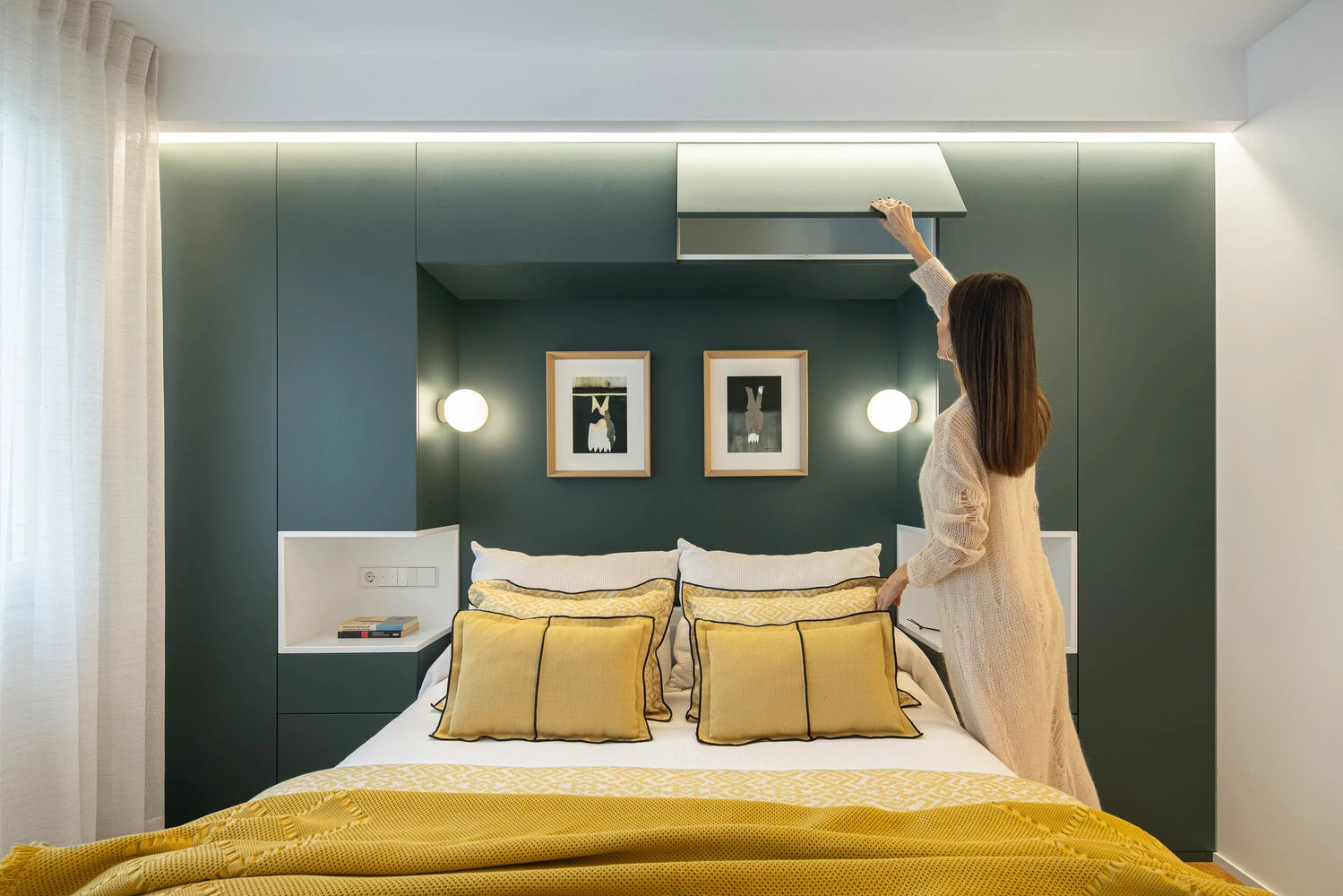 Ante la imposibilidad de no poder reducir la altura libre de los techos, todo el mobiliario integrado está precedido de una falsa viga en la parte superior, que sirve de elemento de paso de instalaciones.