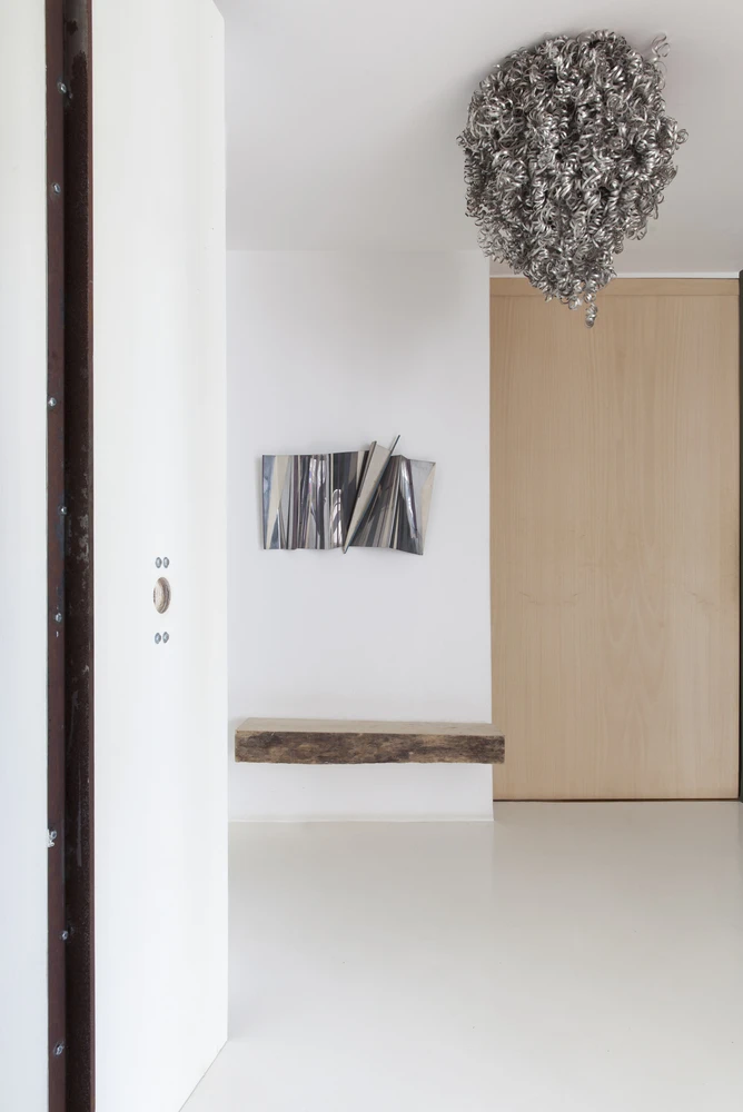 En el hall de entrada se destaca el primer prototipo de la lámpara Biro-Biro, creado por SuperLimão con chips de aluminio. Esta pieza única, suspendida en el techo, introduce la originalidad que se mantiene a lo largo de la casa.