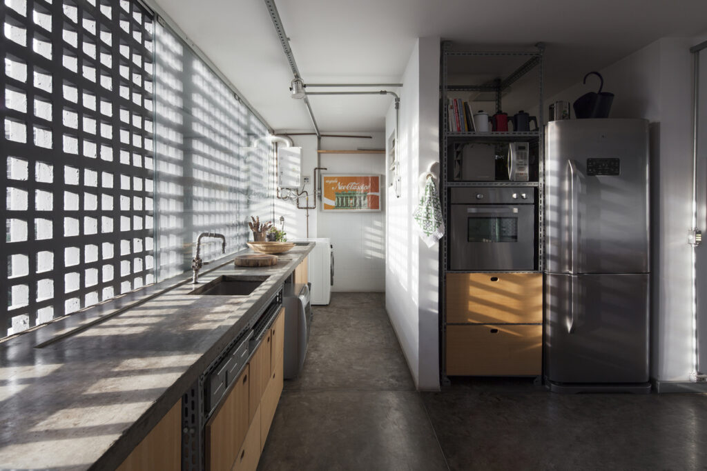 La cocina, abierta al living, se destaca por sus muebles modulares reutilizados de oficinas encontradas en depósitos de chatarra y cuenta con instalaciones de acero inoxidable a la vista.