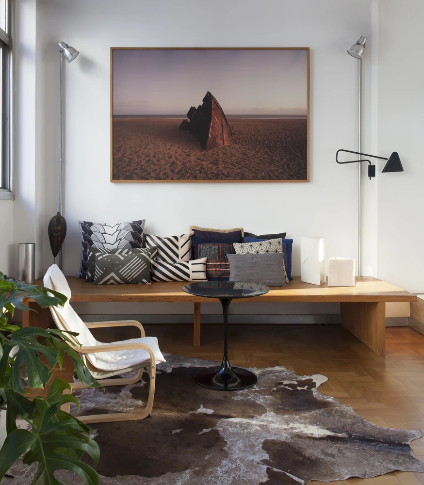 La suite de la pareja refleja un enfoque minimalista, con una cama de madera recuperada diseñada por Diana Albuquerque, al igual que la mesita de noche.