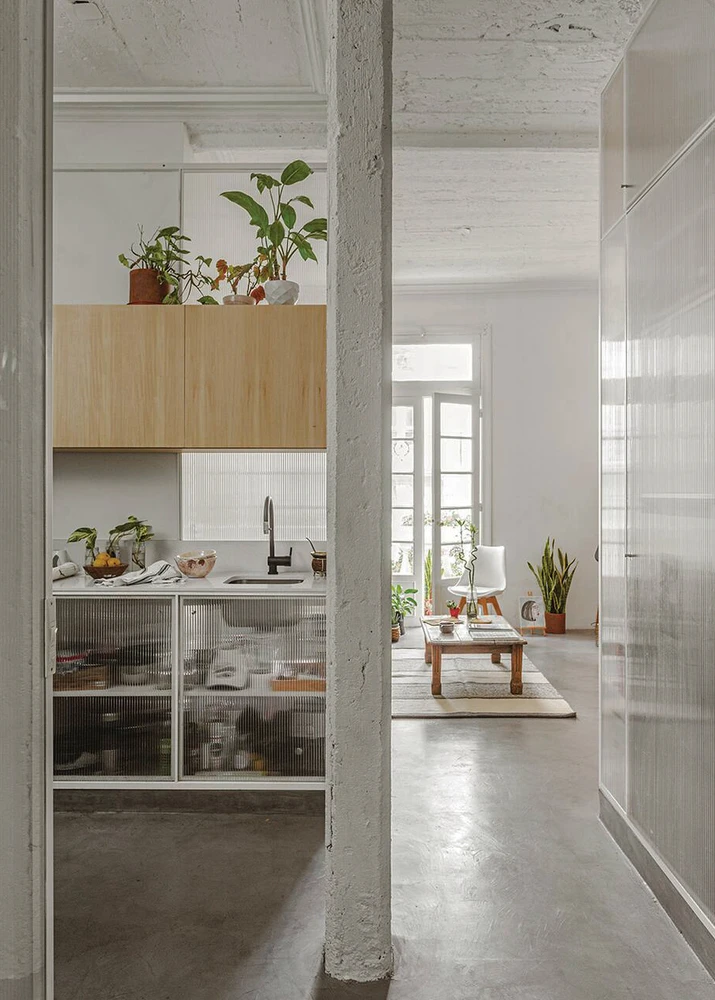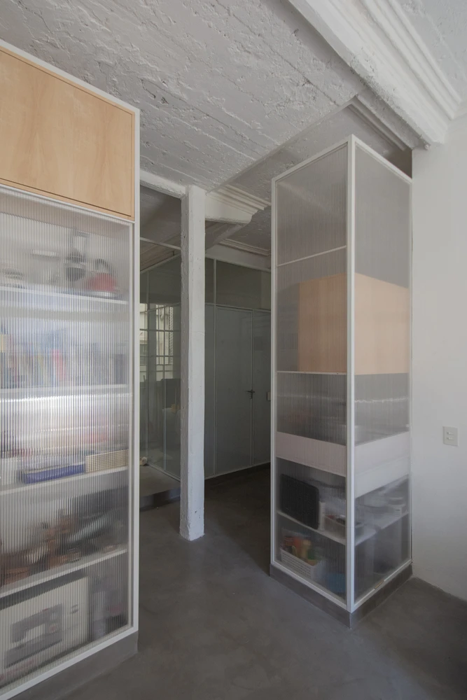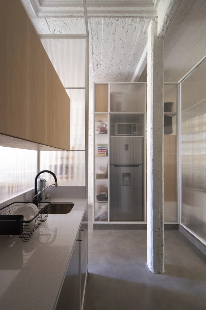 El suelo se volvió continuo mediante la aplicación de microcemento alisado. Además, se utilizaron materiales traslúcidos como el policarbonato para tamizar las visuales, dejando pasar la luz a todo el departamento, así como módulos de guardado en guatambú que dotan de calidez a la intervención.