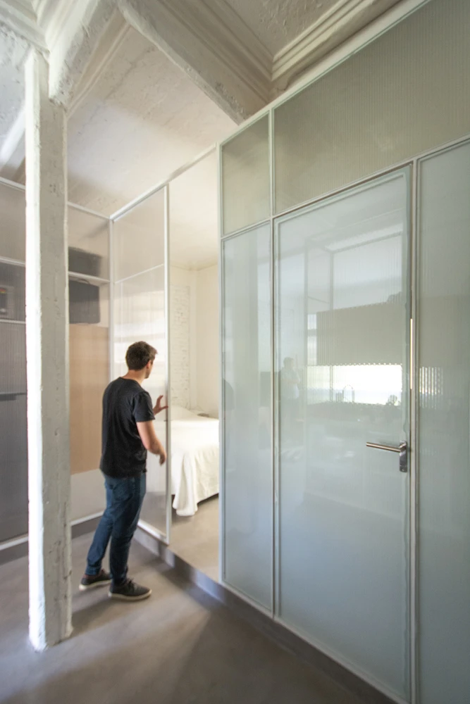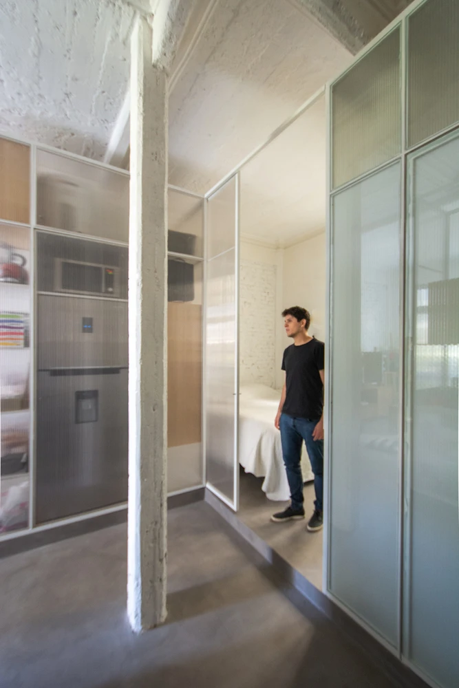 Una de las piezas define el espacio de baño, otra la de cocina y otra se encarga de tener una triple función, otorgando una biblioteca-guardado hacia el espacio de estar-trabajo, alojar algunos electrodomésticos contiguos al espacio de cocina, mientras que hacia el dormitorio se encarga de funcionar como vestidor, complementada con un portón de dos posiciones que permite aislar el dormitorio del resto del departamento.