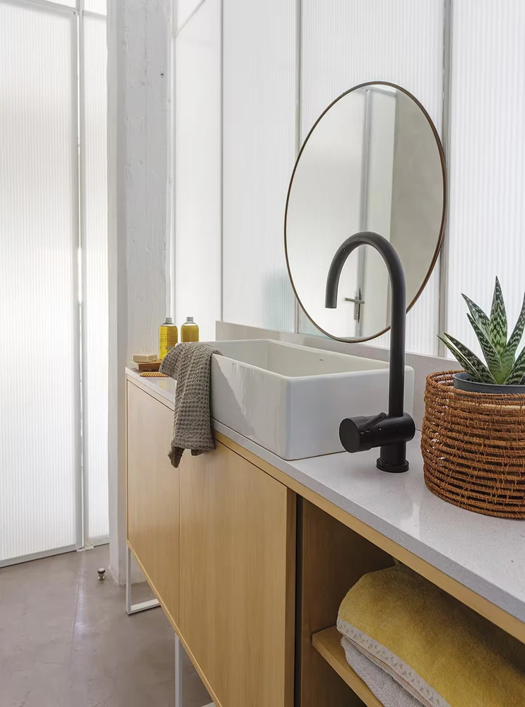 En el caso del baño, se trabajó con un vidrio opalino hacia el exterior y policarbonato hacia el interior, operando como ruptor de puente térmico y evitando la condensación del vapor, al mismo tiempo que se conservaba el ingreso de luz.