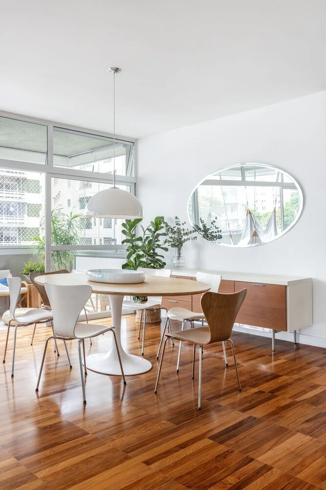 Se priorizaron piezas de mobiliario contemporáneo nacional, como el sofá Lego de Estúdio Bola y el sillón C26 de Carbono, y se combinaron con elementos clásicos del diseño escandinavo, como la mesa Saarinen y las sillas Serie 7 de Anne Jacobsen, que proporcionan una estética moderna y minimalista.