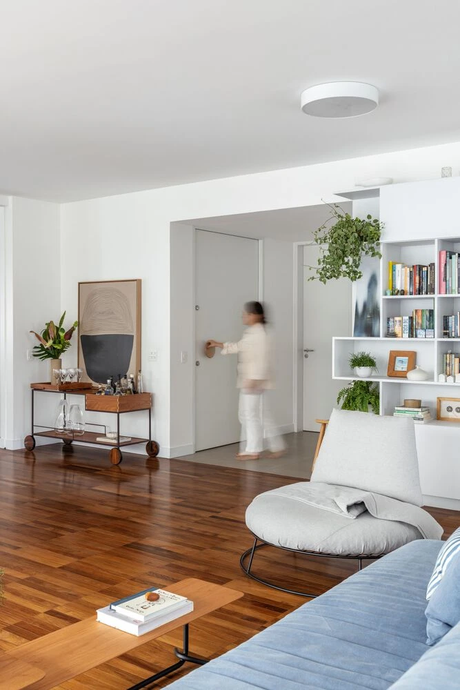 Por otro lado, la estantería de carpintería diseñada a medida que integra las salas satisface la demanda de los dueños de contar con un mueble generoso para organizar libros y objetos.