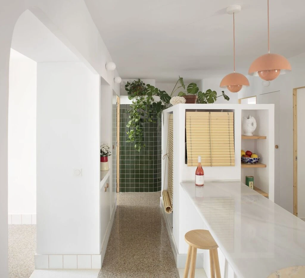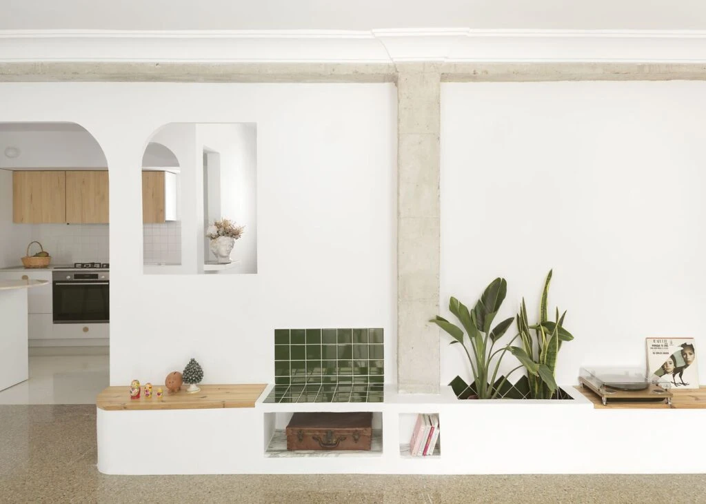 Otorgaron personalidad a la intervención con un revestimiento brillante verde botella con el que se resuelve dar volumen de la ducha, la bandeja que te recibe al entrar en la vivienda y una zona del nuevo banco de uno de los espacios. Mismo revestimiento en tres zonas que ayuda a encontrar el equilibrio entre el material heredado y el nuevo introducido.