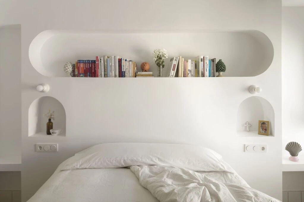 También es importante el hecho de que no llegue al techo ya que permite que desde cualquier punto de la casa haya conexión y entendimiento visual de la nueva trama habitacional. Es lo que da nombre al proyecto “la volteta”. La Volteta, a su vez, estará abrazada por armarios y estanterías, un pasillo equipado que fortalece la idea de prescindir de él.