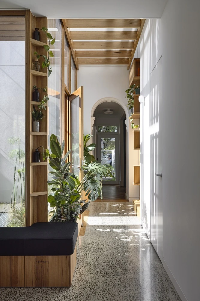 Al eliminar dos habitaciones (arriba y abajo) en el centro del edificio y aprovechar el callejón lateral, la casa logró convertirse en un lugar lleno de luz, con múltiples jardines, un plano de planta flexible, una entrada central y un espectacular atrio soleado.