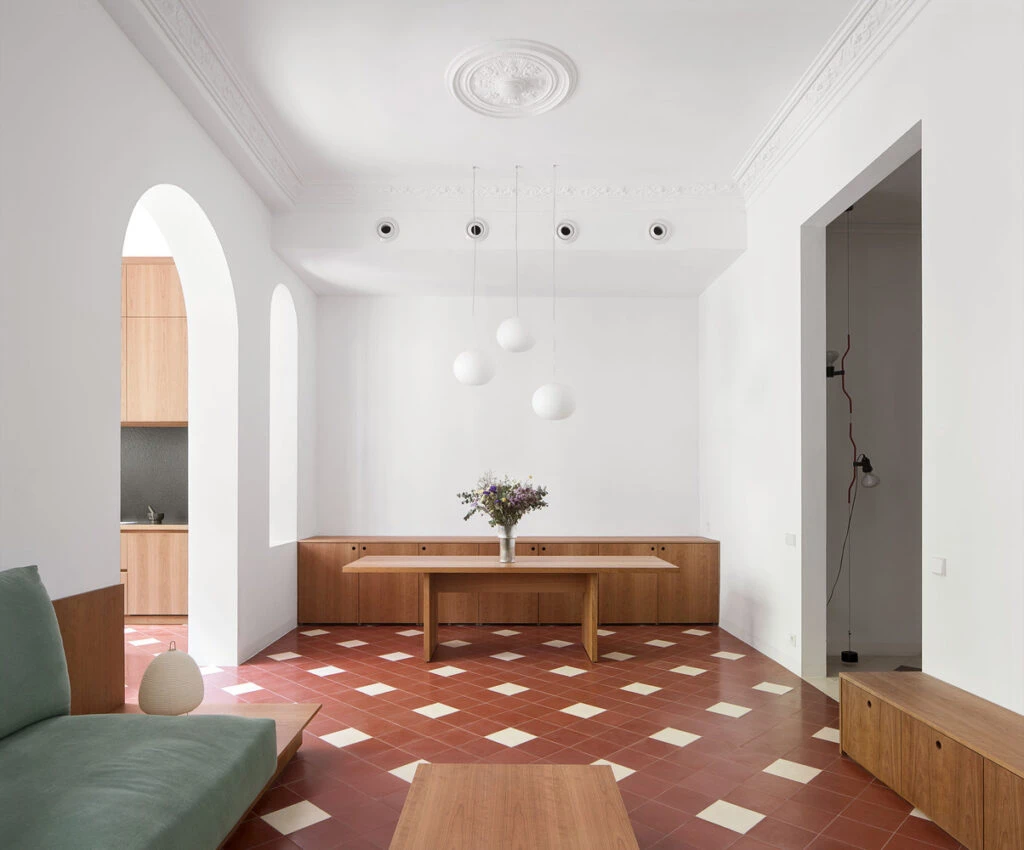 El suelo pretende recuperar su materialidad original con baldosas hidráulicas tradicionales, reinterpretando un diseño contemporáneo.