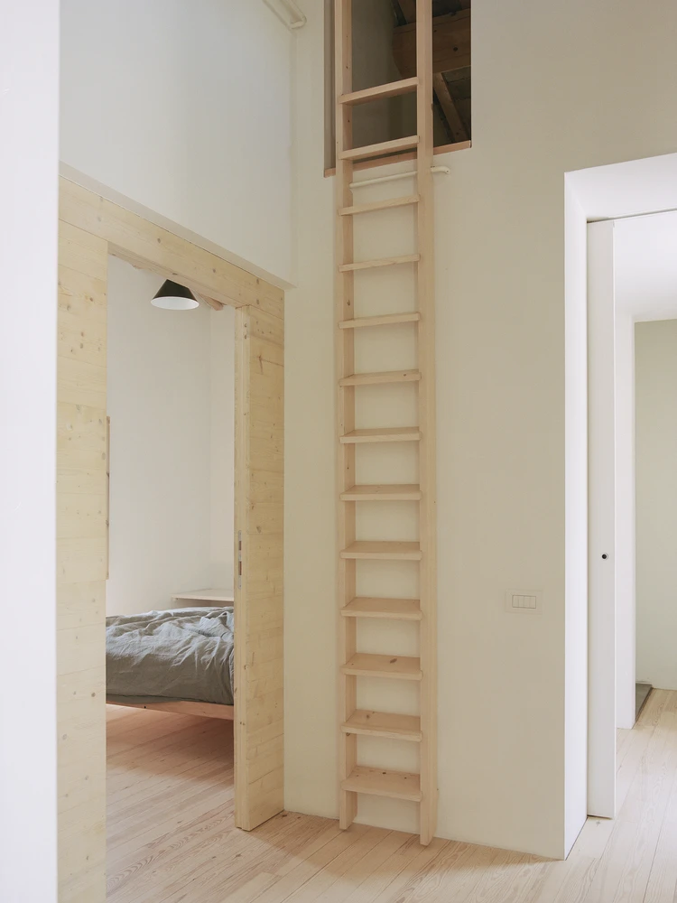 Por otro lado, es importante resaltar que cualquier reducción es siempre una cuestión de organización. Incluso la cocina-living, que incluye chimenea y sofá, está libre de todos los utensilios prácticos que se pueden encontrar en dos pequeñas habitaciones contiguas.