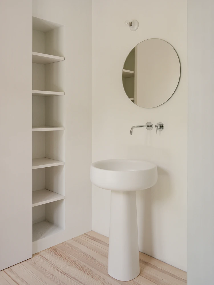 Se complementa con un baño con espejo circular y un pequeño rincón de escritura integrado en el pasillo.