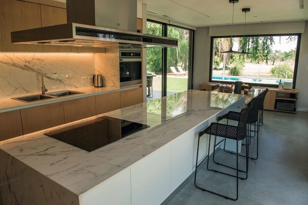 La cocina se renovó por completo para darle una impronta moderna y volverla más funcional. Todas las mesadas se unificaron con un delicado mármol Estatuario y los muebles se hiceron a nuevo en enchapado de Rauvisio blanco mate combinado con roble americano.