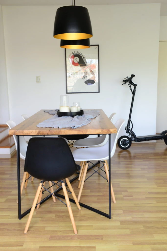 Para el comedor, mesa con patas de hierro y tapa de guayubira en una sola pieza, con sillas Eames combinadas en blanco y negro y lámparas en negro y dorado (Easy). Velones (@berlina_velas). De fondo, una lámina con diseño de Joost Scmidt, maestro de la Bauhaus.