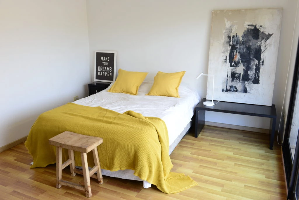 El depto suma un único cuarto en planta alta, decorado en blanco, negro y amarillo. Sobre la mesa de luz de 1,20 m enchapada en wengue se destaca un cuadro de la artista @valeriasala junto a una lámpara de luz puntual (@ilumanfroni).