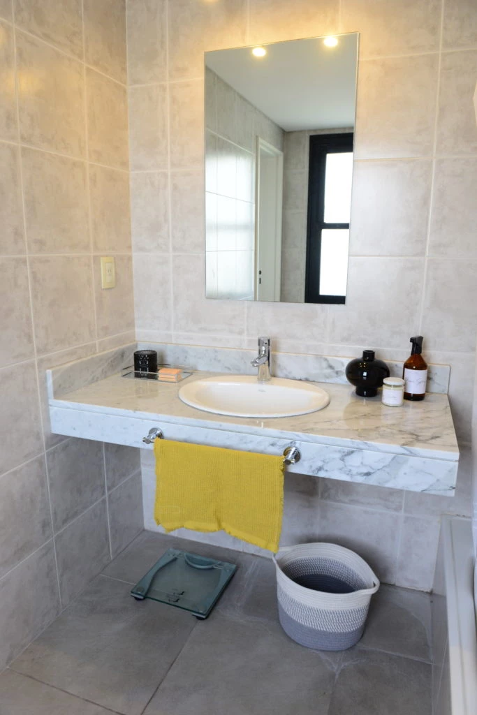 En el antebaño, mesada de mármol de Carrara con bacha embutida y accesorios cromo (@gratinahome).