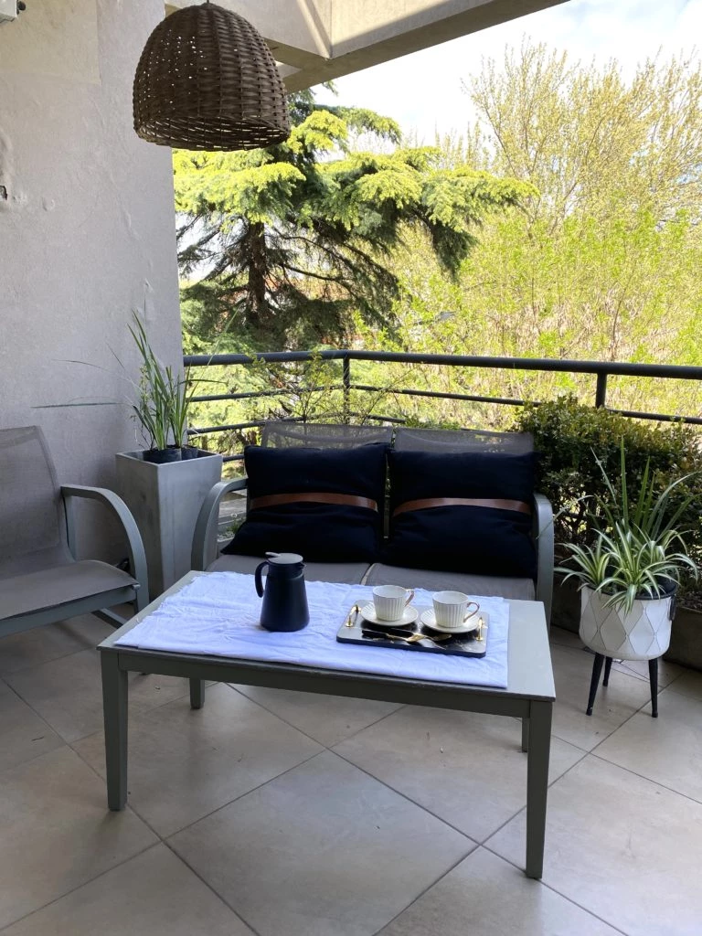 En el balcón, un juego de mesa baja y sillones de aluminio con género apto para exteriores (Sodimac) y macetas de cemento con buxus. Set de bandeja, termo y tazas de café (@lapaqueterie).